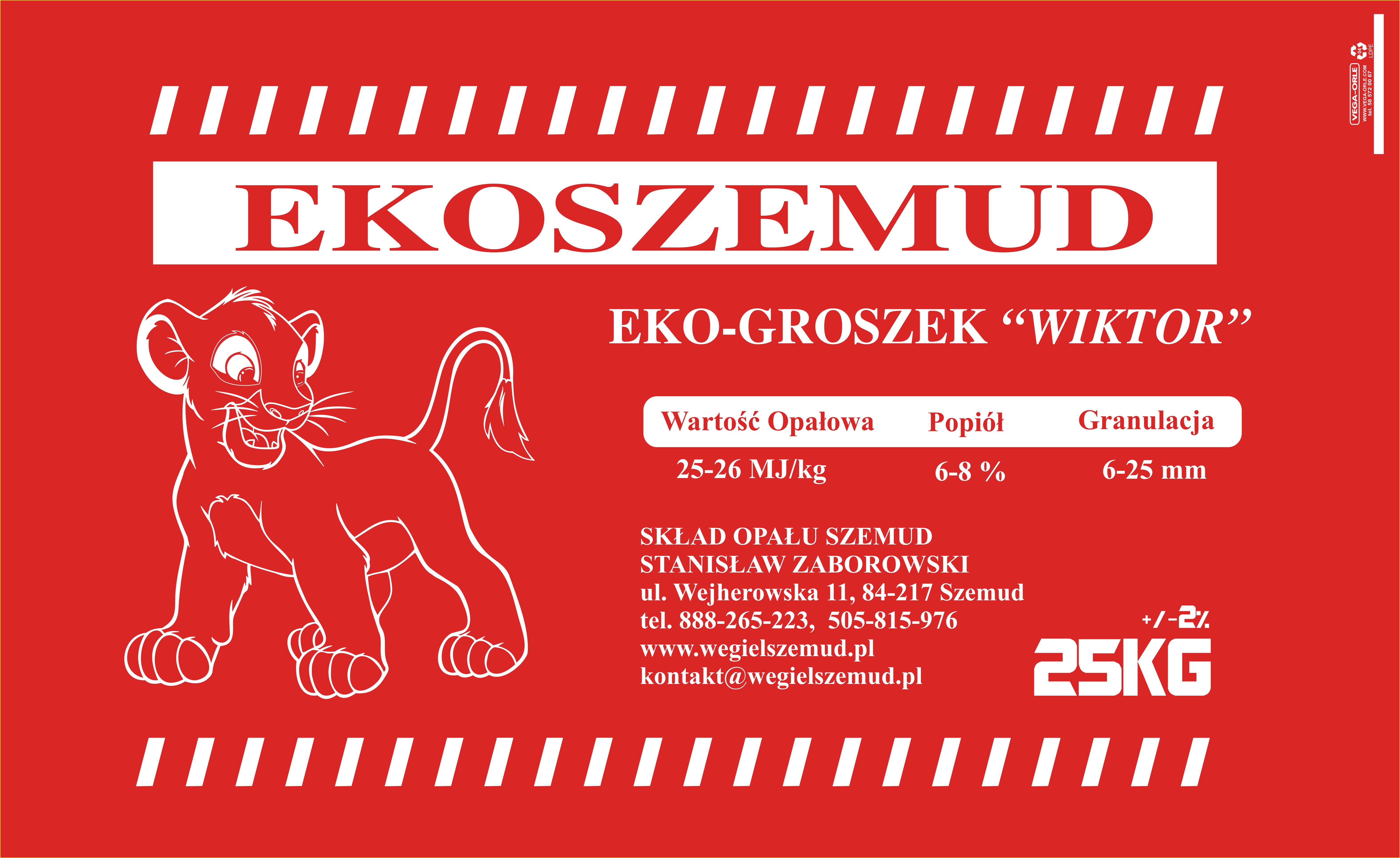 - EKOSZEMUD WIKTOR: Granulacja: 6-25 mm; Wartość opałowa: 25-26MJ/kg; Zawartość popiołu: 6-8%;